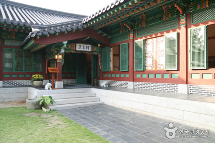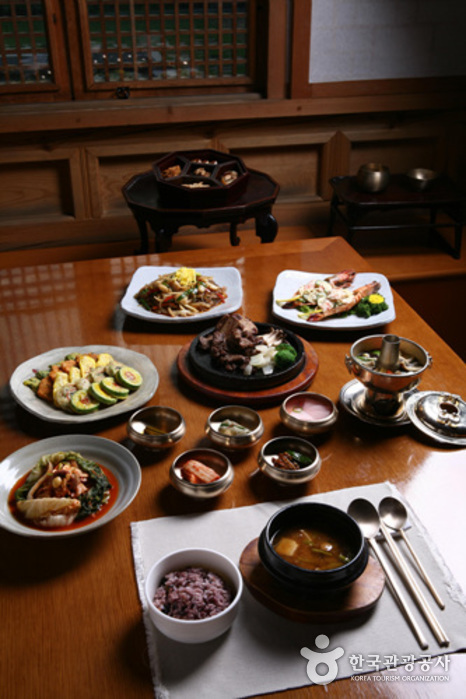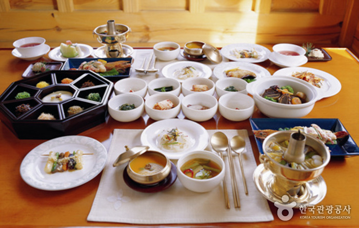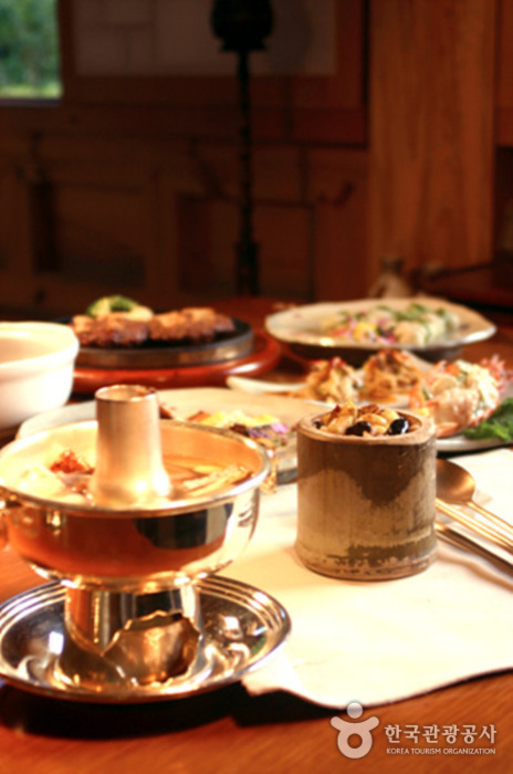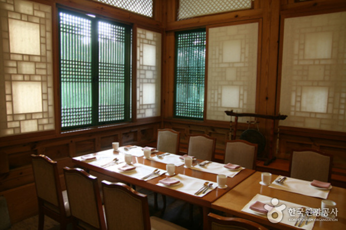 Bongraeheon is a restaurant serving Korean table d’hote, inspired by the royal court of Joseon, in a beautiful traditional hanok building with Dancheong (decorative coloring). The building has a garden with grasses and trees, a garden to the back, and a pond. There are six private rooms and two large halls. Bongraeheon’s menu consists of five course meals: a la carte dishes, and vegan dishes which are flavored using traditional methods and choice ingredients from all around of Korea, once used to prepare the King’s table.