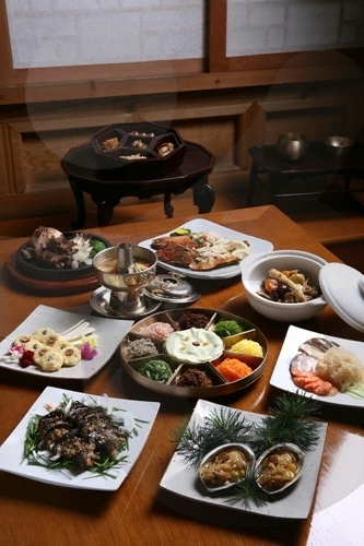 Soo Ra (Healthy porridge with water kimchi, bamboo shoots salad, three braised delicacies, royal hot pot, grilled and marinated Korean beef with vegetables, set meal of steamed rice wrapped in a lotus leaf and soybean paste stew, fresh fruit and Korean fruit punch)