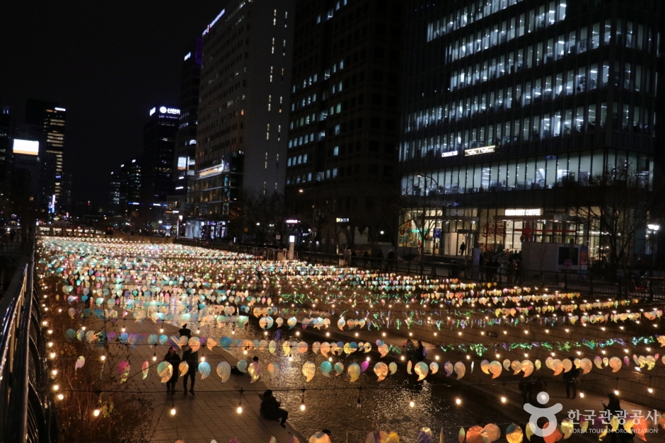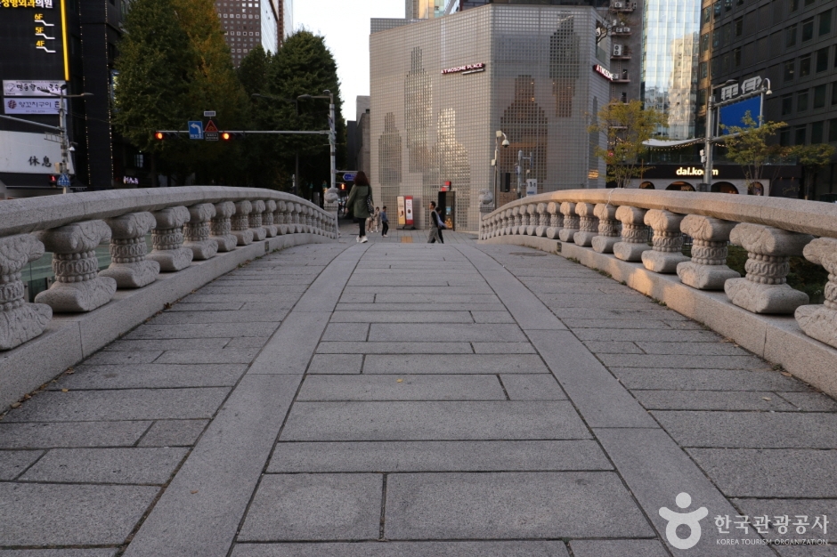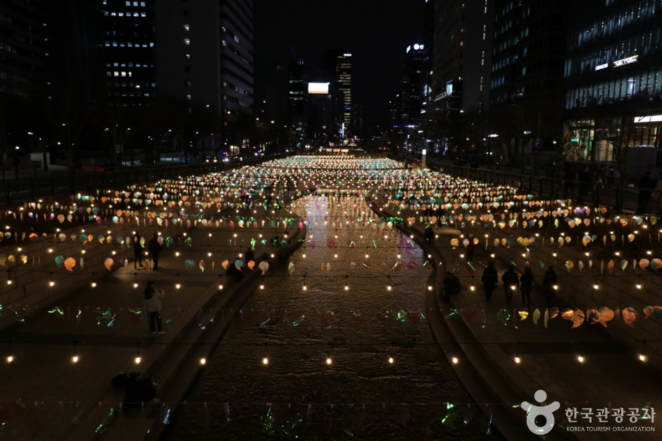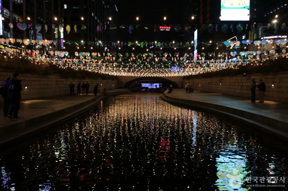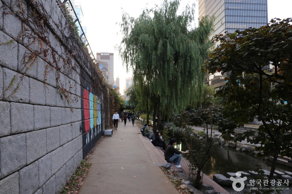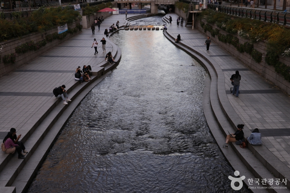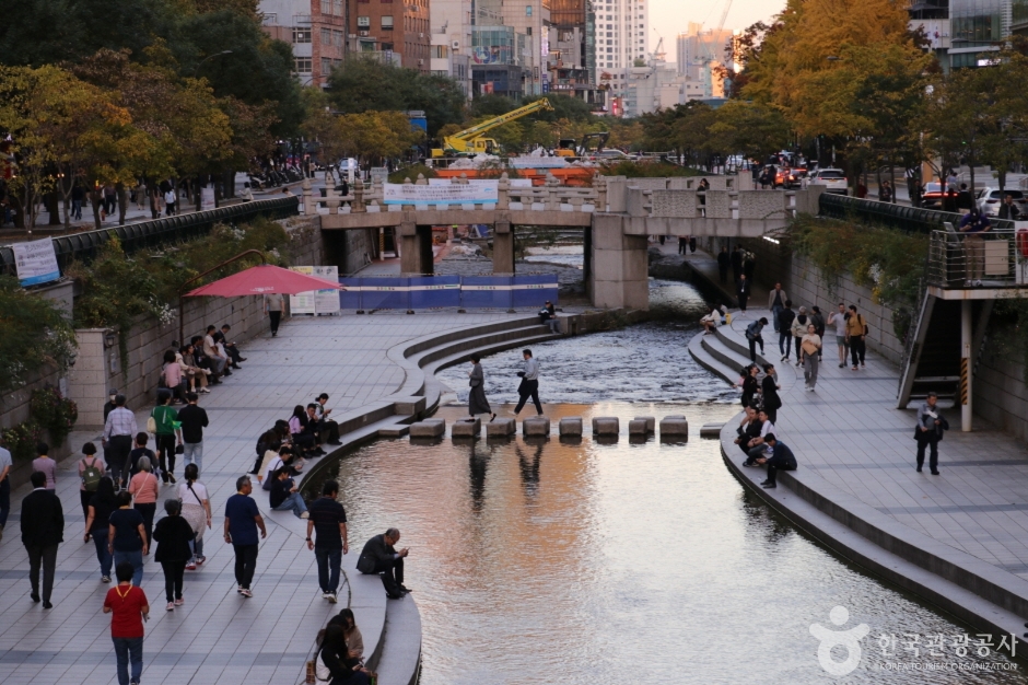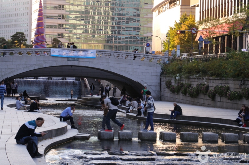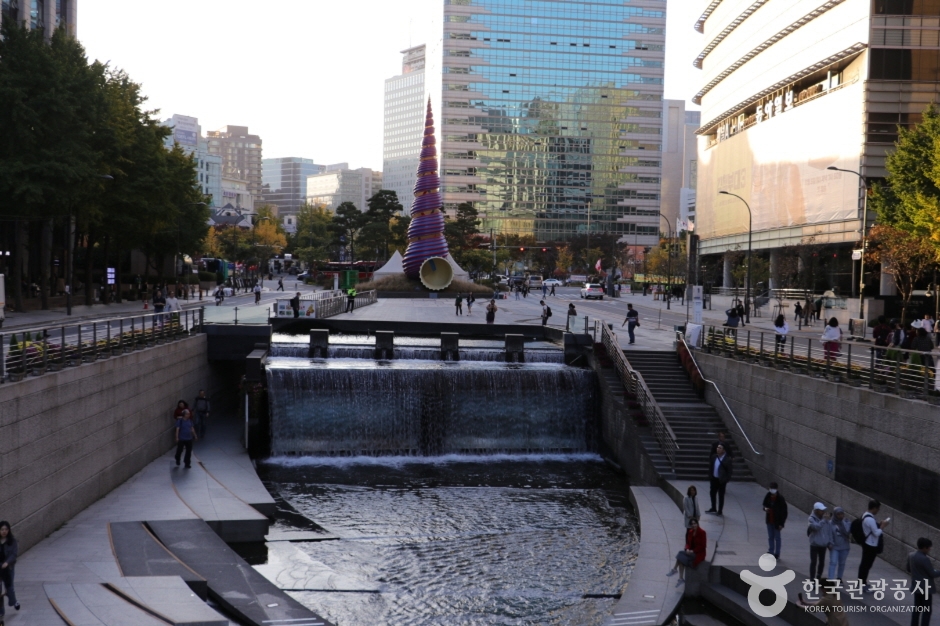 Cheonggye Plaza was built on Sejong-ro Street, where Cheonggyecheon Stream begins. It was built between Dong-A Ilbo, the starting point of the Cheonggyecheon Stream restoration, and Sindap Railroad Bridge, with a length of 160 meters, a x_width of 50 meters, and a total area of 6,962 meters squared. The plaza is decorated with fountains, waterfalls, and walking paths. It was created as a place for meetings, harmony, peace, and unification, to celebrate the significance of the restoration of Cheonggyecheon Stream. A miniaturized version of Cheonggyecheon Stream is displayed here, providing an overview of the restored stream. There are also interpretive panels about the 22 bridges that cross Cheonggyecheon stream. Fountains of various shapes create beautiful scenery. Cheonggyecheon Stream is accessible from the square through stairs on the left and Cheonggye Trail on the right. There is also an 18-meter tunnel on the Cheonggye Trail, providing a unique experience for citizens entering Cheonggyecheon Stream from the plaza. After constructing Cheonggyecheon Plaza, the Seoul Metropolitan Government made it a car-free street on public holidays so that the plaza, waterside area, and streets could be used as cultural spaces for citizens to relax. A spectacular sight is created by three-color lights illuminating the fountains and a two-tiered waterfall coming down from a x_height of four meters. Palseokdam, made of eight stones from eight provinces in Korea, was laid along the waterfall’s sides.