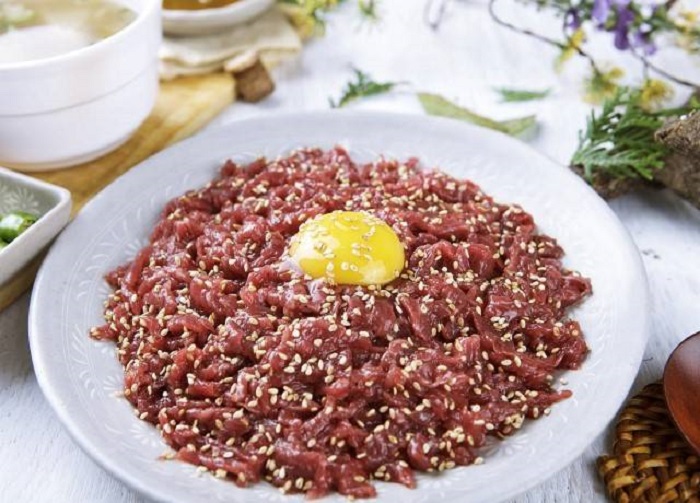 Buchon Yukhoe is a renowned restaurant located in Gwangjang Market’s Beef Tartare Street, selected by the Michelin Guide in 2023. It specializes in yukhoe (beef tartare), a Korean-style raw beef dish marinated with sesame oil and pear. The restaurant uses fresh Korean beef supplied daily, ensuring a delightful and nutty flavor. The simple seasoning enhances the natural taste of the ingredients, and the yolk-topped yukhoe adds visual appeal to the dish.