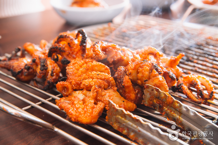 Opened in 1976, Chungmuro Jjukkumi Bulgogi is Michelin-starred restaurant. Their signature dish is jjukkumi (webfoot octopus), which is marinated in hot seasoning using traditional know-how. Grilled over charcoal with pen shells, it offers a perfect dish. The spicy and sweet jjukkumi goes well with the bean sprout soup. When you’re done eating, fry up some rice and enjoy a delicious meal.