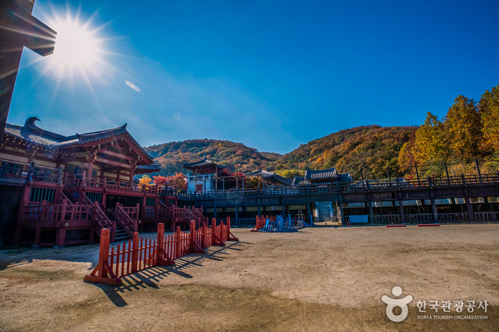 Dae Jang Geum Park is the largest historical drama set of MBC in Korea, featuring various architectural sets reconstructed from different historical periods. The park includes facilities such as the Dae Jang Geum Memorial Set, Mangyeongjeon Hall, Gyujanggak Library, Donggungjeon Palace, and the Inspection Department. It has served as the filming location for famous TV series like “Jumong,” “Lee San, Wind of the Palace,” and “The Great Queen Seondeok,” as well as movies such as “The Face Reader” and “The Treacherous.” Visitors can immerse themselves in history at the royal costume experience room, where they can wear traditional costumes and take photos on the various sets. Additionally, guests can enjoy their time at the herbal teahouse and souvenir shops.