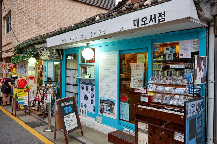 Daeo Bookstore is the oldest bookstore in Seoul that has been maintained in one place since it opened in 1951. Recently, it has been refurbished as a cultural space with a cafe, where one can enjoy coffee, exhibitions, and performances while looking at the yard. Visitors who just want to browse can purchase a souvenir postcard set for admission. Taking a closer look at books that feel the years and objects that have traces of use, they appear to come rather new.