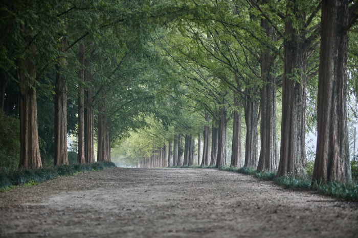 Damyang Metasequoia-lined Road is one of Korea’s most beautiful paths. Metasequoia trees were planted along the street in the early 1970s by the Ministry of Internal Affairs after National Road 24 was rebuilt. At that time, the saplings were only 3 to 4 years old and their branches stretched sparsely out into the sky; now, the trees have grown so high that they seem to block out the sun. Thanks to these stately trees, in 2002 the Korea Forest Service selected the boulevard as one of the most beautiful roads in Korea. The 8.5-kilometer-long boulevard is one of the most popular driving routes in Korea, especially during summer when the trees’ lush green leaves are at their x_height of beauty.