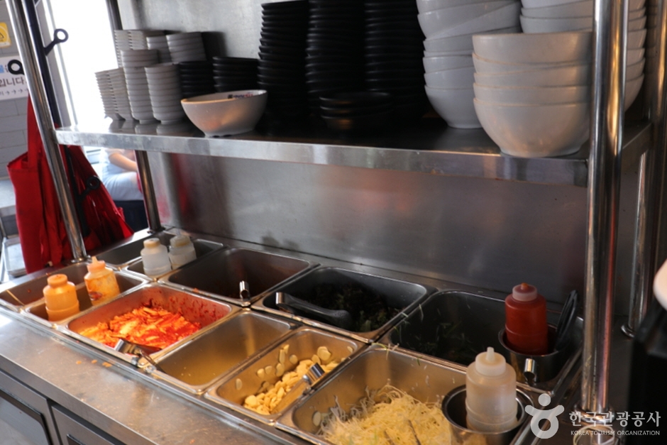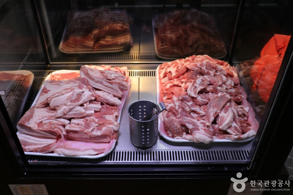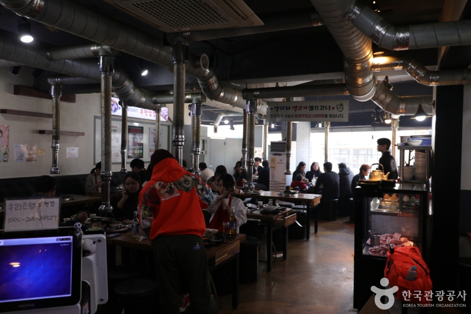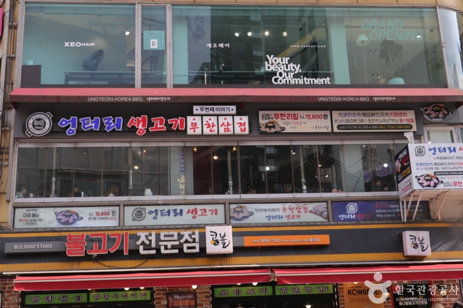 Located near Hongdae, Eongteori Saenggogi is an all-you-can-eat restaurant that specializes in grilled beef and pork. Along with raw meats such as pork belly, pork shoulder, beef sirloin, and beef brisket, the restaurant offers dishes including cold buckwheat noodles, kimchi jjigae, and soybean paste jjigae. A variety of sauces, kimchi, vegetables, and other side dishes are available at the salad bar. The great thing is that if you order a bowl of steamed rice, you can serve it as much as you want.