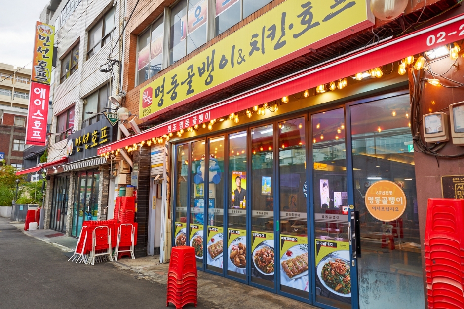 Located in Euljiro Nogari Alley, Manseon Hof is a beer bar. The place is bustling late at night with people drinking beer and eating snacks like nogari (dried young pollack) and fried chicken at sidewalk tables. It is a great place to enjoy a cold draft beer and grilled dried young pollack dipped in spicy sauce and mayonnaise. Golbaengi muchim (sea snail salad) and gyeran mari (rolled omelet) are also other popular accompaniments.