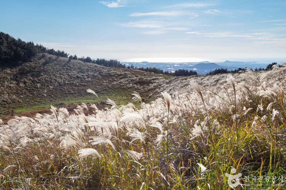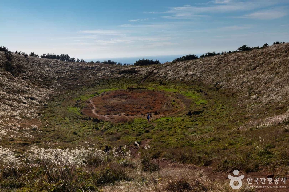 Geum Parasitic Cone is one of the most famous parasitic cones in the western mountainous region of Jeju. It is a satellite volcanic edifice that has a large circular crater (52 meters deep) and a crater at the summit, and the two peaks in the south and the north are connected by a low slope from east to west. The crater at the summit once held an abundant volume of water but it is now empty. The name Geum Parasitic Cone is speculated to have derived from an archaic word “Gom,” which means “god.” Therefore, it can be interpreted that this parasitic cone has been deified since the ancient times. Pines, cedars, briers, bo trees and Oriental photinia can be found near the circular crater and the lake area.