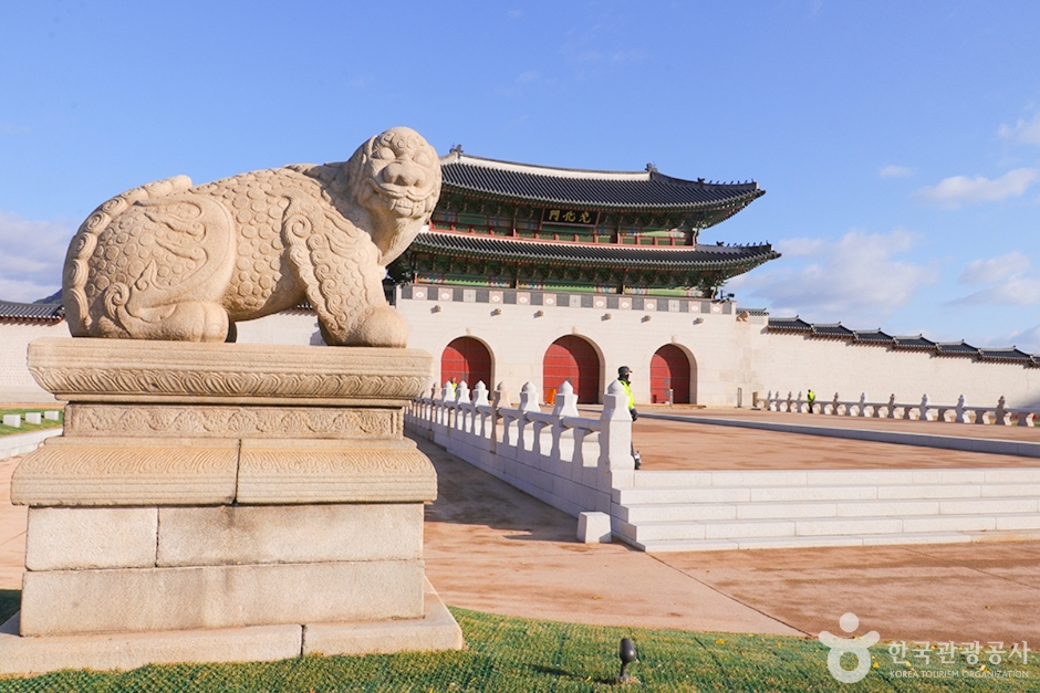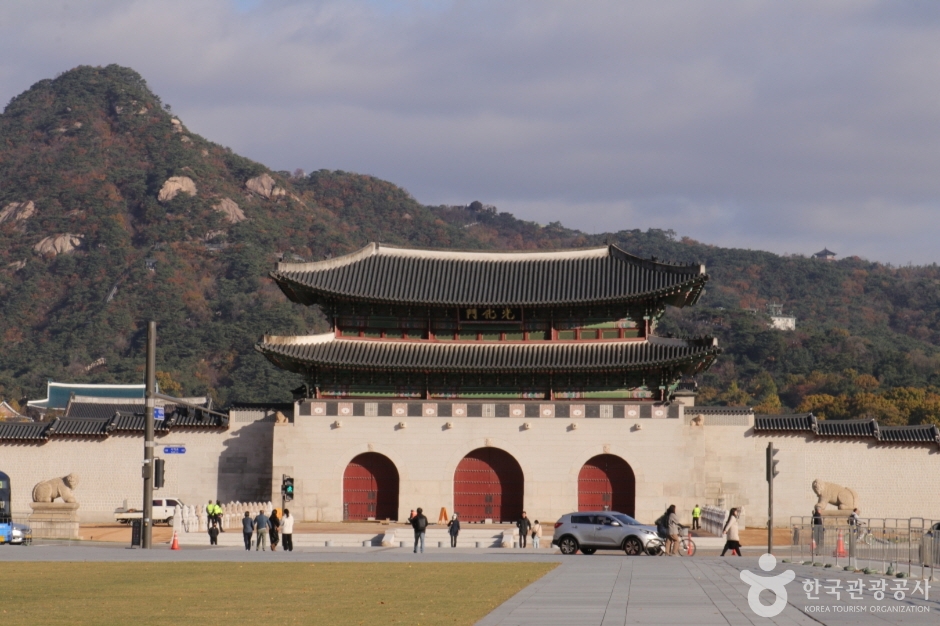 Built in 1395 under the reign of King Taejo, the first king of the Joseon dynasty, Gwanghwamun Gate is the southern gate of Gyeongbokgung Palace. It is also the main gate of the palace, therefore larger and fancier in comparison to the other gates. Gwanghwamun Gate consists of three arched gates; the center gate was used by the king, while the other two were used by the crown prince and royal officials. The tall granite walls of the gate serve as a platform for the wooden gate tower that watches over the city. The gate has a sign with its name written at the top center of the gate tower.