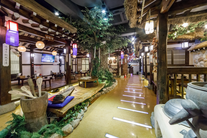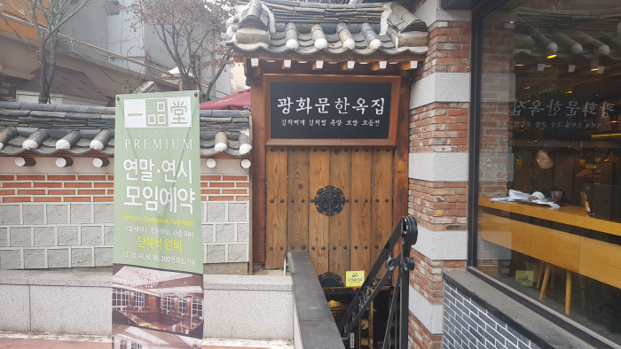 A store with rooms reproducing a traditional kitchen. The best menu at this restaurant is napa wraps with pork. This is a Korean cuisine located in Gwanghwamun Gate, Seoul.