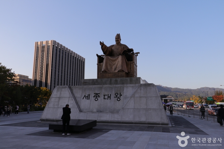 King Sejong Statue can be found at Seoul’s Gwanghawmun Square. The statue commemorates King Sejong the Great (1397-1450, reign 1418-1450), the fourth king of Joseon (1392-1897). He is thought to be the greatest king in Korean history, for he is credited with great developments in science and technology, expansion of Joseon’s territory, and the creation of the Korean script, [Hangeul]. King Sejong’s likeness can be found on the 10,000 won bill as well.
