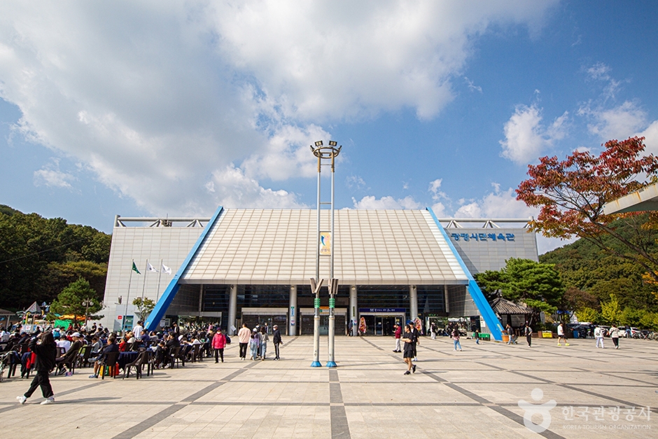 Gwangmyeong Indoor Gymnasium is a stadium equipped with seating for 3,000 spectators. It houses facilities for physical training, including golf, fitness, and table tennis. The spacious and vibrant lawn plaza immediately draws attention. This complex includes an open art hall for performances, sports facilities like an inline bicycle track and basketball courts, and amenities such as a children’s playground and an outdoor water play area. Additionally, it features a 16-meter-high artificial rock-climbing wall.