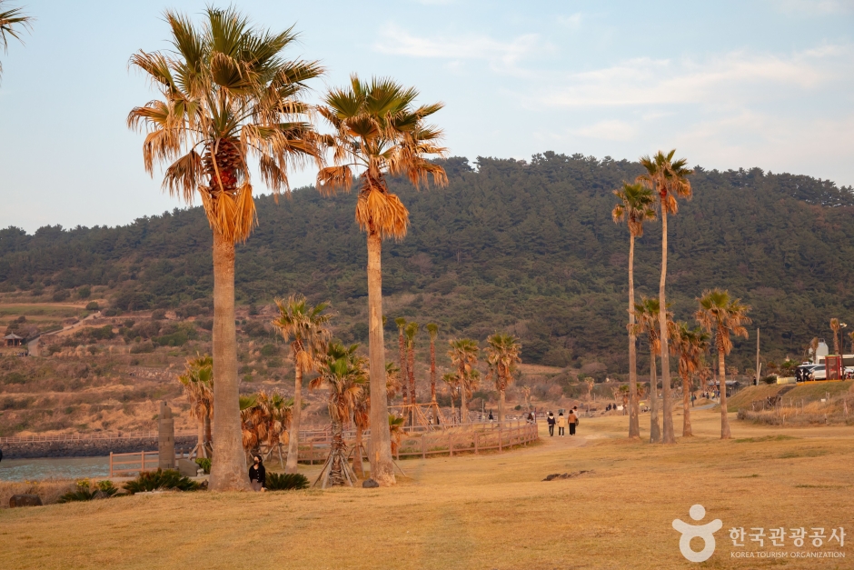 Hamdeok Beach is located along Jeju Olle Trail Course 19. It is also referred to as Hamdeok Seoubonghaebyeon Beach due to the volcanic cone nearby. Located just 20 kilometers from Jeju International Airport, the beach is famous for its great scenery of emerald-blue waters, tall palm trees, and white sandy shore. The beach is considered one of Jeju’s top three beaches. To the western end of the beach, there is a bridge built over the water. Additional amenities include a grassy field perfect for picnics and a coastal walking trail. In particular, many people visit during summer evenings to enjoy the night sea. Seoubong Volcanic Cone is beautiful in spring when it is covered in yellow canola blossoms. Climbing up to the summit offers fantastic views of the entire area, including Hallasan Mountain on clear days.