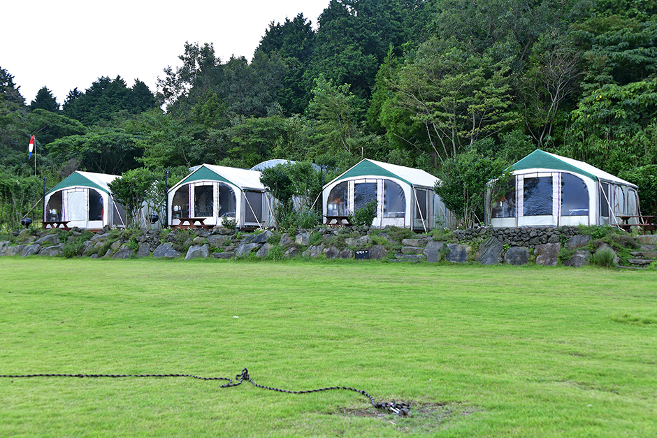 Best Hill is a campground at Namjo-ro, Jeju, at the foot of Banongoreum Parasitic Cone, surrounded by Gotjawal, a jungle-like forest featuring ferns growing on stone-rich land. It is located about 20 to 30 minutes from Jeju International Airport, so it is a good base camp for the surrounding tourist sites as well. Onsite facilities include the pension itself, glamping campground, drone game range, 3D experience, and hot air balloon experience. The pension features a variety of room arrangements, from Camellia to Herb, Meditation, Family, and Experience Rooms, for groups of all sizes. The glamping campground has private bathrooms attached to each tent for convenience. The hot air balloon experience allows riders to take part in the take-off and landing processes. There’s a large grassy playground for kids and a covered swimming pool in the summer for hours of fun. Nearby sights include Eco Land Theme Park, Jeju Stone Park, Hamdeok Beach, and Saryeoni Forest Trail.