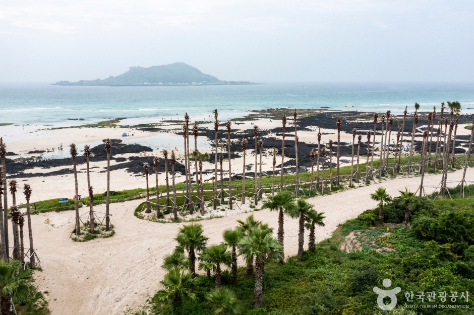 Hyeopjae Beach, encircled by lush pine forests, seamlessly extends into Geumneung Beach. The beach features smooth white sand, shallow waters, and a gentle slope ideal for swimming. Camping is available at Songlim, along with various amenities. The view of the emerald-colored sea and the distant Biyangdo Island offers magnificent scenery, with the sunsets being particularly breathtaking.
