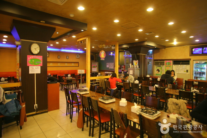Situated in Sindang-dong Tteokbokki Town, I Love Sindangdong Tteokbokki is a famous tteokbokki restaurant. Tteokbokki is a typical Korean street food, consisting of rice cakes made with flour or rice flour and stir-fried in red chili paste. The rice cakes are simmered in a broth with seasonings, along with fish cakes, vegetables, boiled eggs, mandu, and other ingredients. The best thing is that the dish can be customized with various ingredients such as cheese, ramyeon noodles, chewy noodles, and ham. Leftover broth can be fried with rice for a satisfying meal.