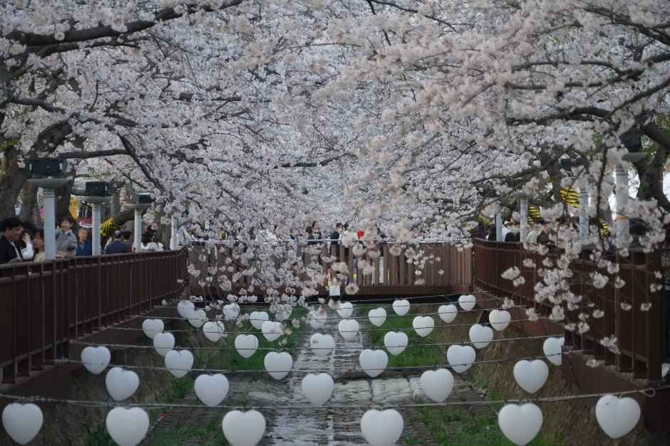 The area around Yeojwacheon Stream is well known as one of Jinhae’s best spots for viewing cherry blossoms. It is also the location of the bridge where the two leading characters, Gwanu and Chaewon of “Romance (2002),” an MBC TV series, first met as tourists who came to Jinhae to enjoy Jinhae Gunhangje Festival. After the episode was aired, the bridge instantly became popular and widely known as the Romance Bridge. Each April, the entire city of Jinhae is filled with cherry blossoms, but the Yeojwacheon Stream area has the most beautiful cherry blossoms which makes it a prime tourist attraction.