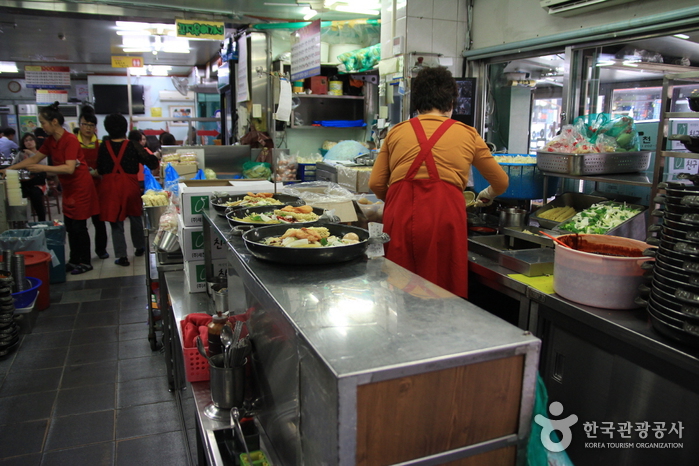 Mabongrim Halmeonijip specializes in instant tteokbokki. The spicy and flavorful tteokbokki with gochujang sauce is their signature dish. It is served in a hot pot, it can be customized with rice cakes, fish cakes, extra ramyeon noodles, mandu, and other various ingredients. The restaurant is so famous that it is said to be the original restaurant of tteokbokki, and has been featured in several TV programs.