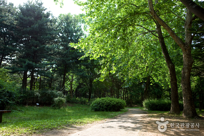 Amenities and facilities include an outdoor wedding hall, walking course, basketball court, volleyball court (also used for foot volleyball), tennis court, barefoot walking path, and outdoor workout equipment. Memorial sites and monuments like the memorial of Patriot Yun Bong-Gil can also be found scattered throughout the park grounds.