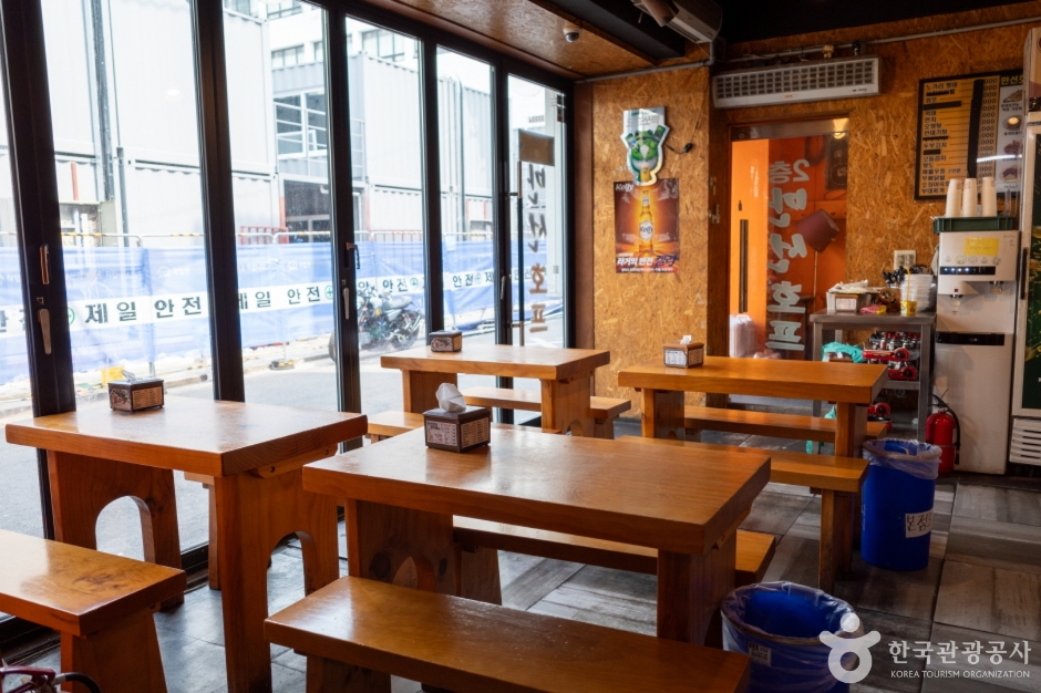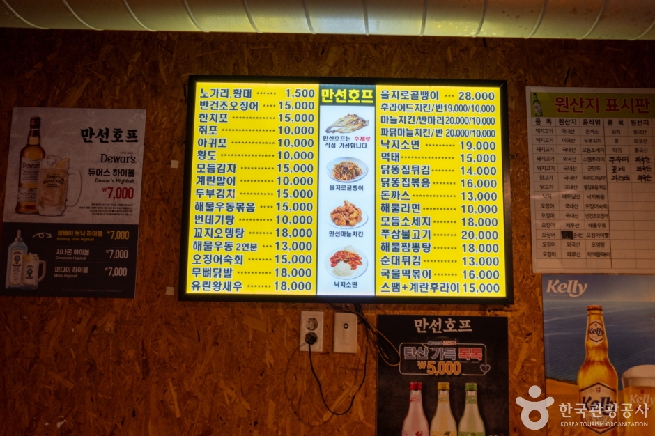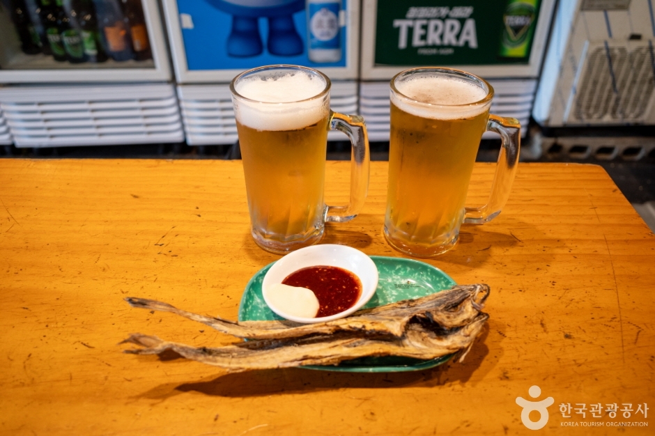 Located in Euljiro Nogari Alley, Manseon Hof is a beer bar. The place is bustling late at night with people drinking beer and eating snacks like nogari (dried young pollack) and fried chicken at sidewalk tables. It is a great place to enjoy a cold draft beer and grilled dried young pollack dipped in spicy sauce and mayonnaise. Golbaengi muchim (sea snail salad) and gyeran mari (rolled omelet) are also other popular accompaniments.