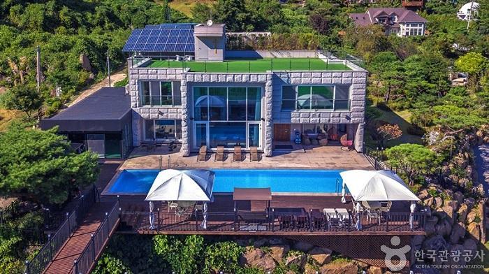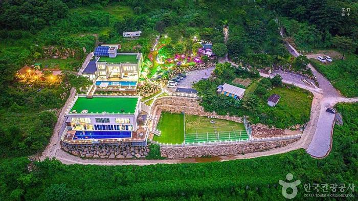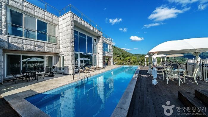 Miramonti Pool Villa Pension is located in Buk-myeon, Gapyeong-gun, Gyeonggi-do and has beautiful mountain views to the front and back. There is one private pension and three pool villa pensions. The private pension has five rooms and four bathrooms and can accommodate up to 30 group guests. There is a private outdoor swimming pool in the front yard and an indoor jungle gym. Pool villas are all two-story structures equipped with a lukewarm indoor pool. The rooms are equipped with a kitchen, a barbecue area, and a bathtub. Nearby tourist attactions include Nami Island and Petite France.