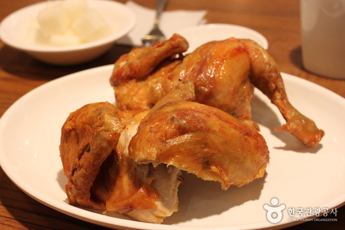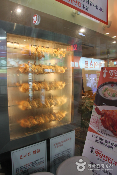 Myeongdong Yeongyang Center specializes in roasted chicken and ginseng chicken soup. The jeongi gui tongdak (rotisserie chicken) is light and juicy with just the right amount of fat, and the crispy skin is excellent. The vinegar-marinated radishes are a must-have side dish. Samgye tang (ginseng chicken soup) is also the signature dish of the restaurant. The lunch special, Tongdak set menu (Roasted chicken set menu), features roasted chicken, chicken soup, nutritional bread, and vegetables, offering a satisfying ensemble.