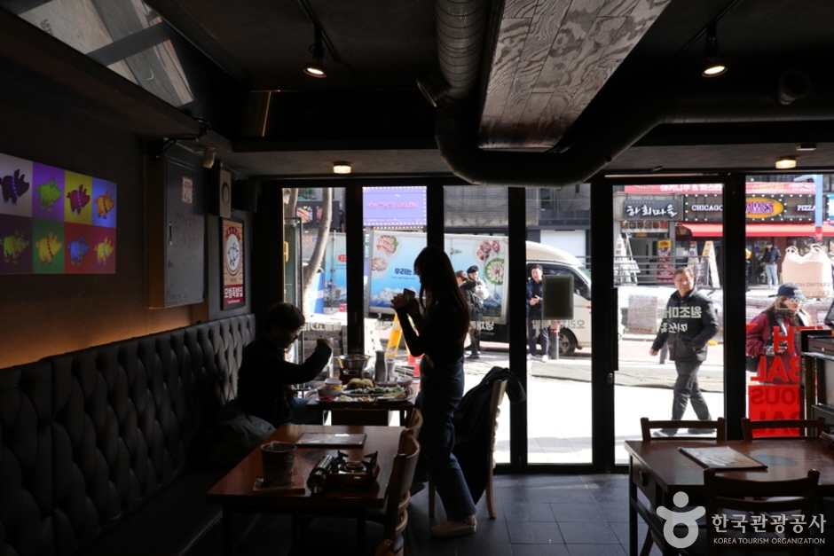 Located near Hongik Univ. Station, Donsoobaek specializes in dwaeji gukbap (pork and rice soup). Dwaeji gukbap is a dish originated in Busan, Gyeongnam Province, and is made with boiled pork in a broth made from pork bones. Their signature dish, Donsoobaek Set Menu, ise served with warm boiled pork slices and kimchi cabbage wraps with pork.