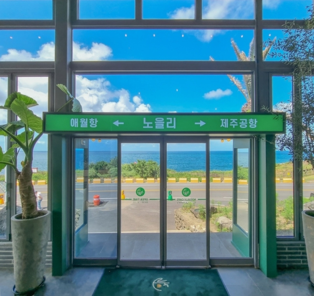 Noeully is a dessert café located in Gueom-ri, Aewol-eup, Jeju-si. The entrance and interior are decorated like a bus stop and a glass greenhouse, respectively, allowing visitors to enjoy tropical plants and the ocean view. It consists of a rooftop café on the second floor and a sky garden on the third floor, as a no-kids zone except on the first floor. Chairs and tables face the sea for an open view of the Jeju sea and sunset, making this café a popular spot to visit for taking photos to post on social media. One of the charms of Noeully is that visitors can enjoy flowers here all year round, such as mustard flowers, hydrangeas, sunflowers, cosmos, and buckwheat flowers. The representative menu item is Briquette bread, a briquette-shaped glutinous rice bread filled with strawberry jam. In addition, the menu includes a variety of drinks, coffee, scones, and cookies.
