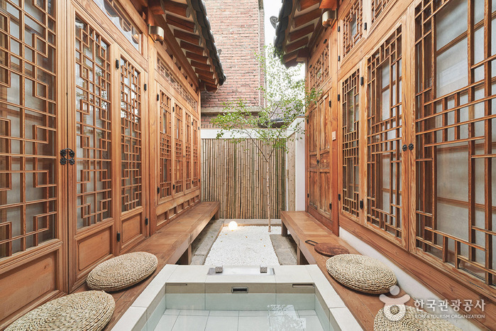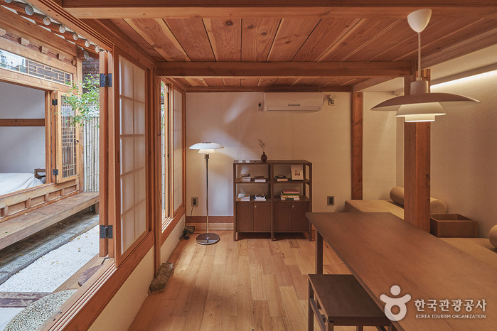Ildogilbak in Seochon Village, Seoul, is a private hanok stay that has been stylishly renovated with modern facilities. The bedroom, kitchen and dining room are located around the courtyard. Tired travellers can soak their feet in the small courtyard footbath while sitting on the veranda. There’s a queen size bed in the bedroom, and a large table in the dining room where you can read a book and chat. There is also an attic space where you can fall asleep looking at the stars through a small skylight. The kitchen is well equipped, and there’s a tub in the bathroom.