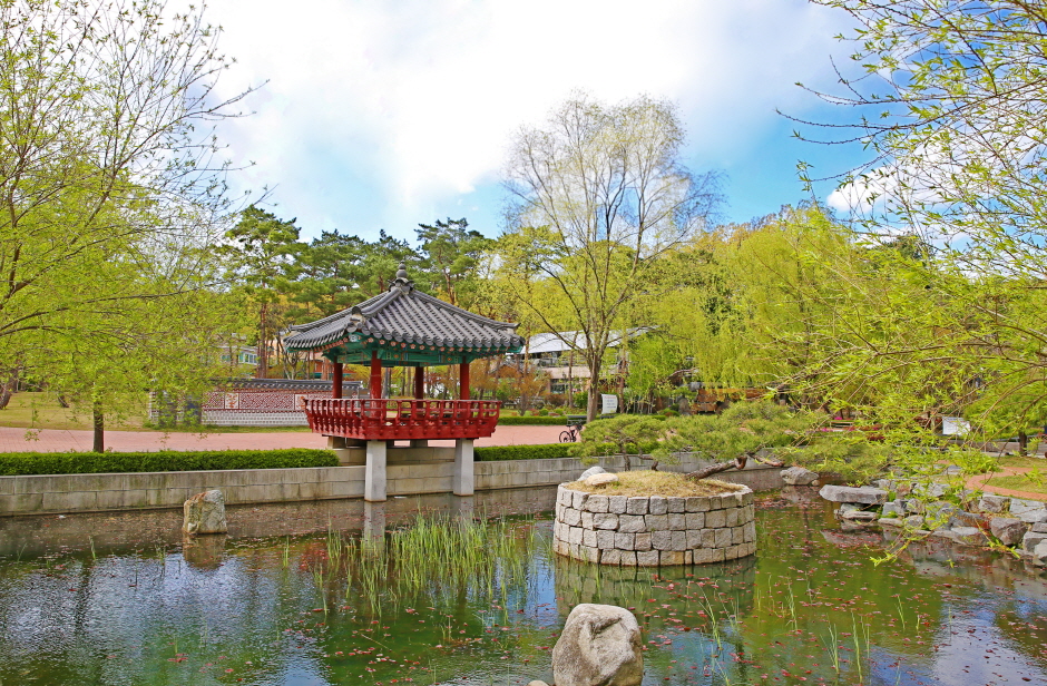 Wondangsaem Pond is named after the Wondang village, where the Yun family settled about 600 years ago. It is a park that harmoniously blends a traditional pond with a Hall of Rejoicing Pavilion called Samojeong, a wall fall, and a floral wall. During autumn, the golden foliage of an 800-year-old ginkgo tree enriches the surroundings, and a deck path around the tree offers a delightful stroll.