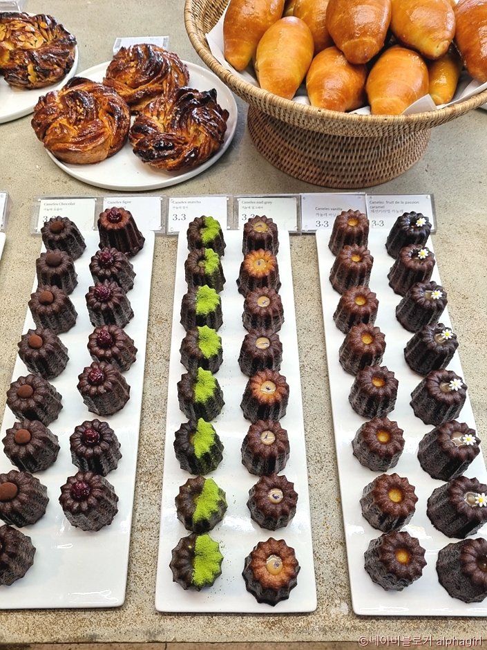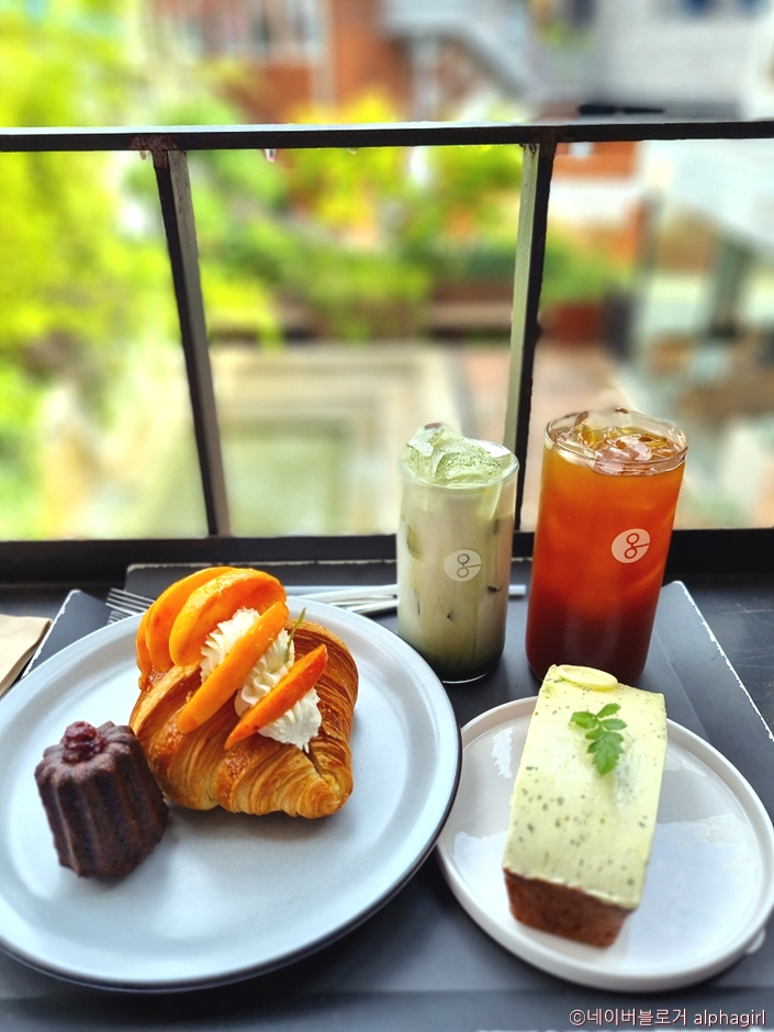 This bakery in Seongsu-dong boasts a colorful and unique visual, and is gaining popularity for its “cruffin,” a hybrid of a croissant and muffin. The menu includes a variety of breads and desserts, such as canelé, pound cake, crumble, and mille-feuille, making it a paradise for bread-lovers. The courtyard of the building, which was remodeled from an old factory, has thick bushes and a small square pond, offering a unique view. The floor-to-ceiling windows in this two-story building create the feeling of a wide, open space, making it full of photo opportunities.