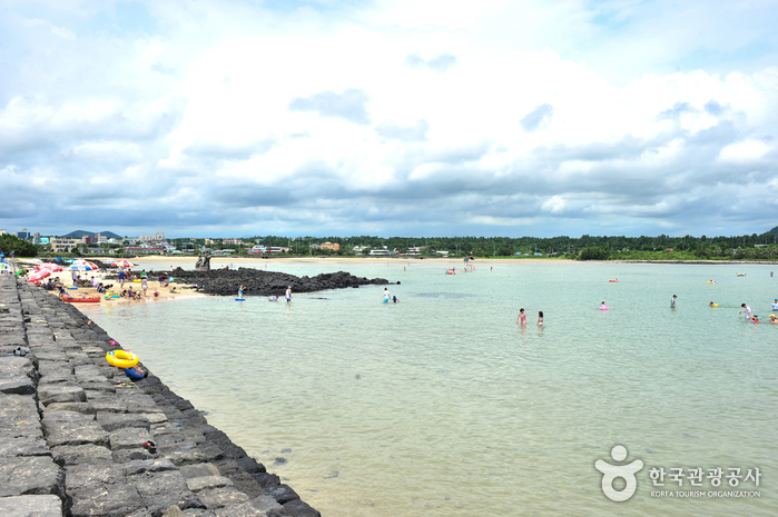 Pyoseon Beach in Seogwipo is a spacious beach, taking up more than 150,000 m². During low tide, the beach looks like an elegant circle, and it becomes a circular lake less than 1 meter deep during high tide, and displays many different colors. The beach is a great place for children to play and for watching the sunrise. The sand on the beach is formed out of broken shells, and sand baths are believed to be effective for people suffering from neuralgia. Every August, this beautiful beach hosts the Pyoseon White Sand Festival, which offers fun and colorful events. The beach is equipped with excellent amenities (a campground, abundant parking space, dressing rooms and shower rooms) and surrounded by nearby attractions, such as Seongeup Folk Village and Jeju Folk Village Museum.