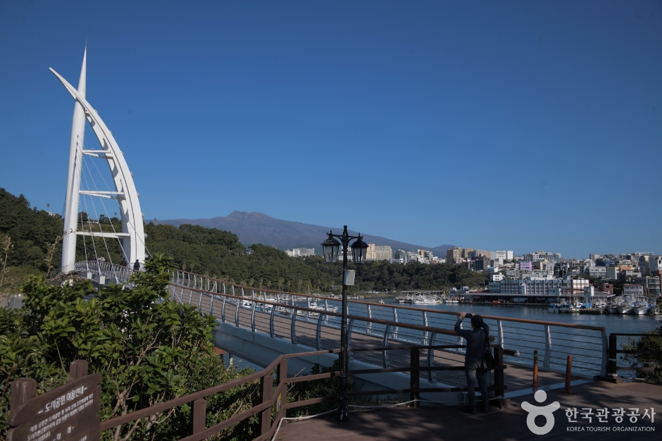 Saeyeongyo Bridge connects Seogwipo Port to the uninhabited Saeseom Island. Its name means “a bridge creating new relationships.” The walking path features musical benches and is renowned for its sunset and night views. There is a beautiful musical fountain show twice a day. It’s a pleasant walk from Cheonjiyeonpokpo Falls, crossing the Saeyeongyo Bridge to Saeseom Island.