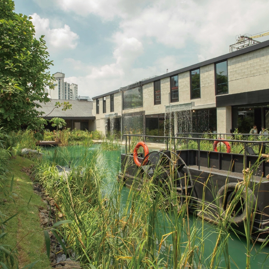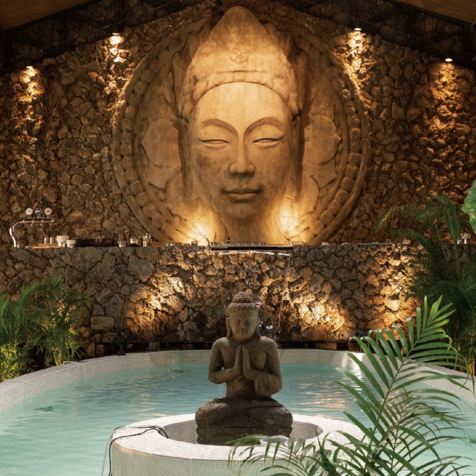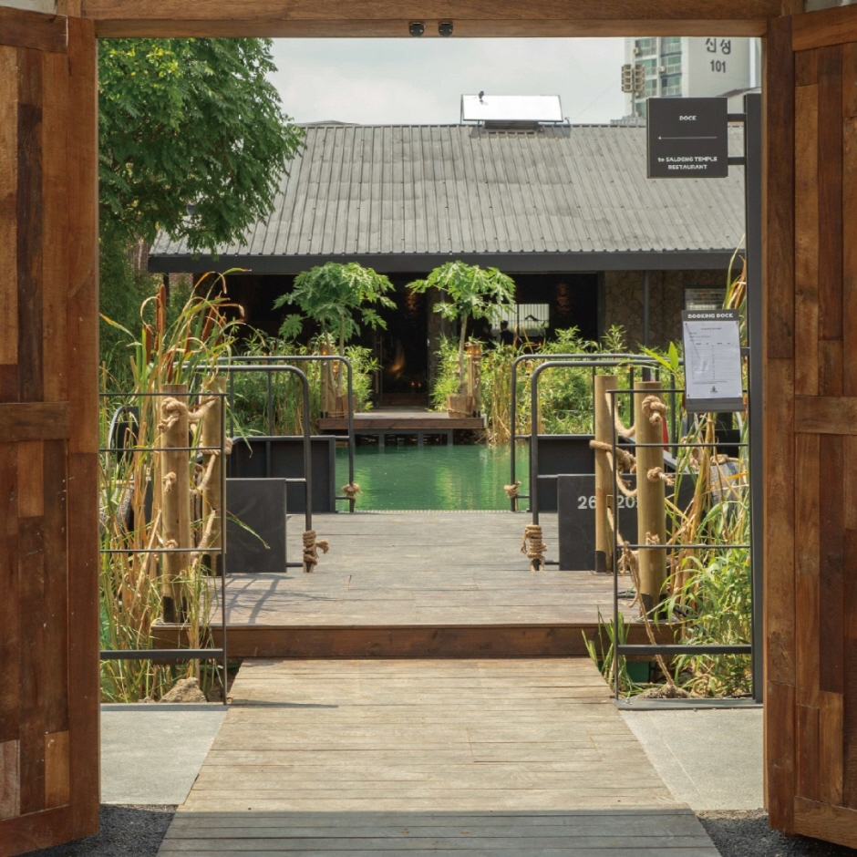 Saladaeng Temple is a French fusion restaurant based on Thai cuisine. It is also known for being accessible by boat. Inside, there is an emerald-colored swimming pool, a central Buddha statue, and grand Buddha statues on the walls. The signature menu features Saladaen temple samdan tray (Saladang Temple three layer tray) with dim sum, deep-fried oysters, shrimp tart, salmon, creme brulee, financier, fruits, and more.