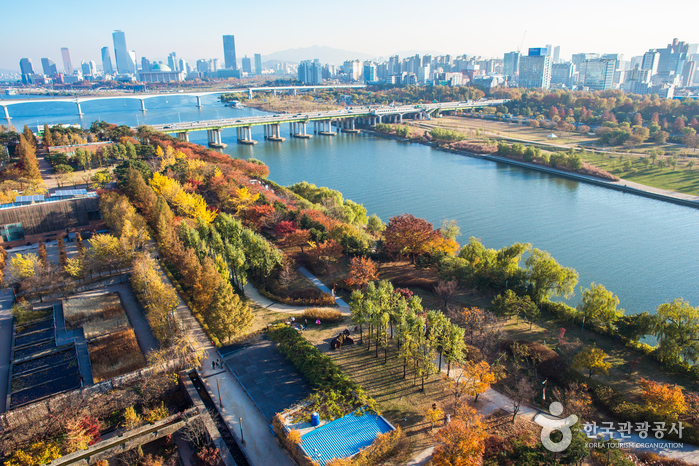 Near Mapo-gu, Mangwon Hangang Park is situated on the northern part of the river, between Wonhyodaegyo Bridge and Seongsandaegyo Bridge. It offers lush grass perfect for picnics and promenades. Since it’s located close to the World Cup Stadium, this spacious park is often full of residents and visitors. There is a wide array of excellent amenities: a bike trail, an outdoor swimming pool, sports facilities, and a dock for water sports such as yachting, waterskiing, and motor boating. Cultural attractions near the park include Mangwon Pavilion and Jeoldusan Martyrs’ Shrine.