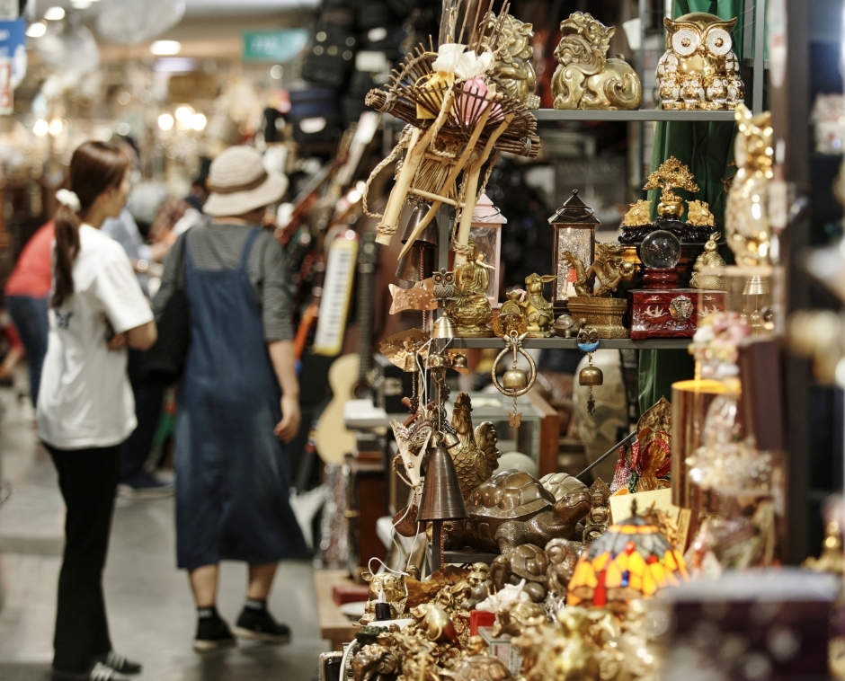 The Seoul Folk Flea Market originated from the flea market in Hwanghak-dong where many street shops and vendors gathered around Cheonggyecheon Stream before it was restored and modernized into its current state. The market was relocated to the Dongdaemun History & Culture Park (Formerly Dongdaemun Stadium) while the Cheonggyecheon Stream was undergoing restorations, and was moved back to Cheonggyecheon Stream sometime later. Seoul City aims to market Seoul Folk Flea Market as a new shopping spot at its current location, the former site of Sungin Girls’ Middle School on Cheonggyeo 8-ga Street, near Cheonggyeocheon Stream to develop the Korean representative folk flea market-related tourism industry.