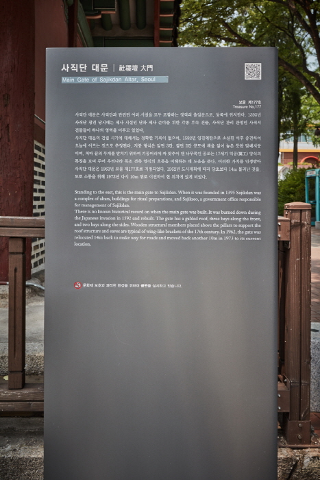 The name of the park dates back to 1395 when Taejo Yi Sung-gye made Sajik Altar (altar to the State deities) at the center of the park. “Sa” refers to the deity of the earth while “jik” refers to the deity of the five grains. Rites wishing for a good harvest were held regularly at Sajik Altar.