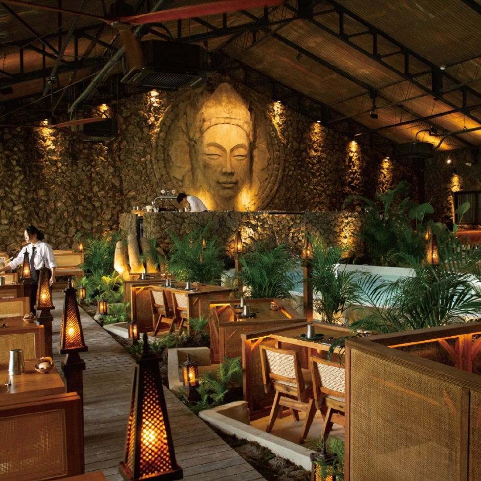 Saladaeng Temple is a French fusion restaurant based on Thai cuisine. It is also known for being accessible by boat. Inside, there is an emerald-colored swimming pool, a central Buddha statue, and grand Buddha statues on the walls. The signature menu features Saladaen temple samdan tray (Saladang Temple three layer tray) with dim sum, deep-fried oysters, shrimp tart, salmon, creme brulee, financier, fruits, and more.