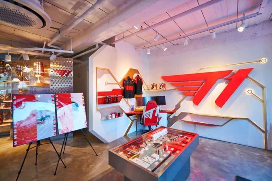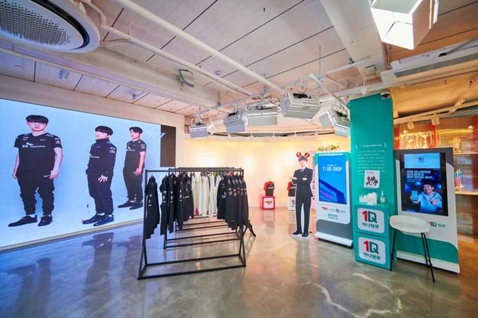 It is a space and goods shop for fans of the LoL pro game team T1 who enjoy e-sports. A life-sized figure of the legendary pro gamer Faker is at the entrance, and trophies won in previous LoL-related competitions are on display. It is a place where you can enjoy T1 up close by engraving your name on the same uniform as the players.
