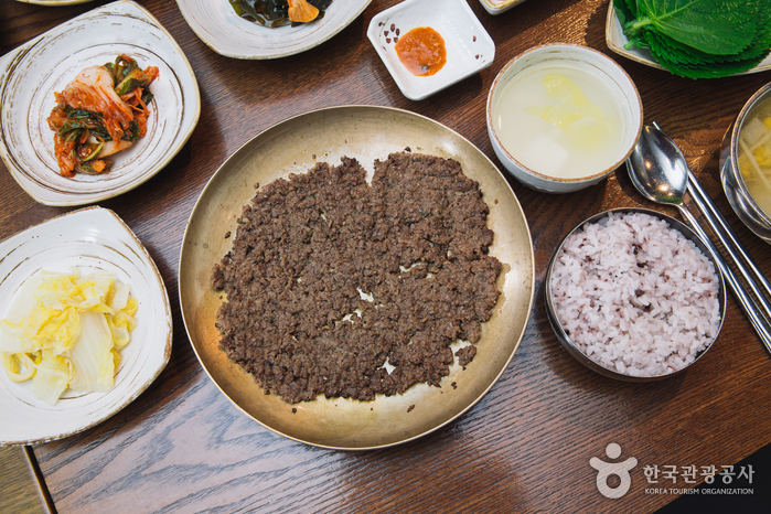 Located in Mapo, Yukjeon Hoekwan is a Korean restaurant that has been selected for the Michelin Guide Seoul 2023. It has kept its original taste through four generations. The signature dish is the Bassak bulgogi (thin-sliced bulgogi), which is served without soup and has a moist juiciness, tender texture, and not-too-sweet seasoning. Patrons have the option to other dishes including yukhoe bibimbap (beef tartare bibimbap), nakji bokkeum (stir-fried octopus), bossam (kimchi cabbage wraps with pork), and samhap (skate, pork, and kimchi combo). In addition, the handcrafted makgeolli (unrefined rice wine) made in their own brewery is a must-try.
